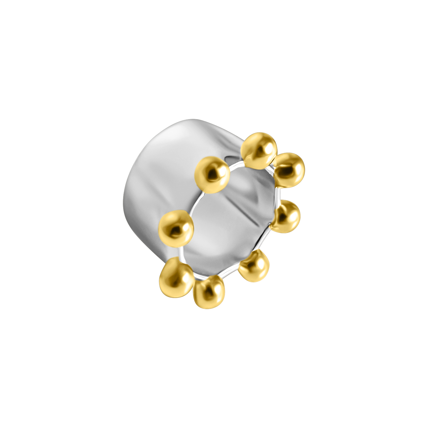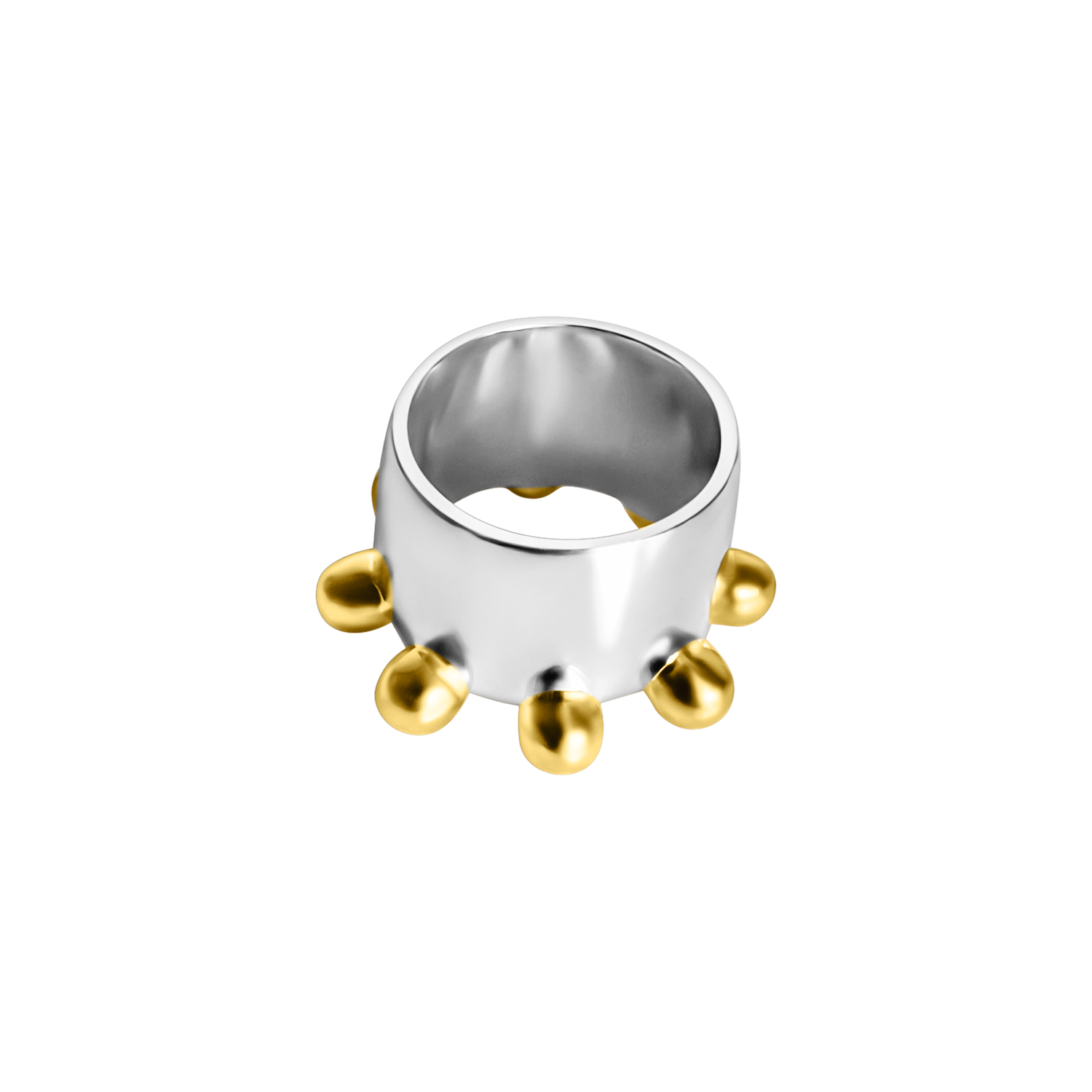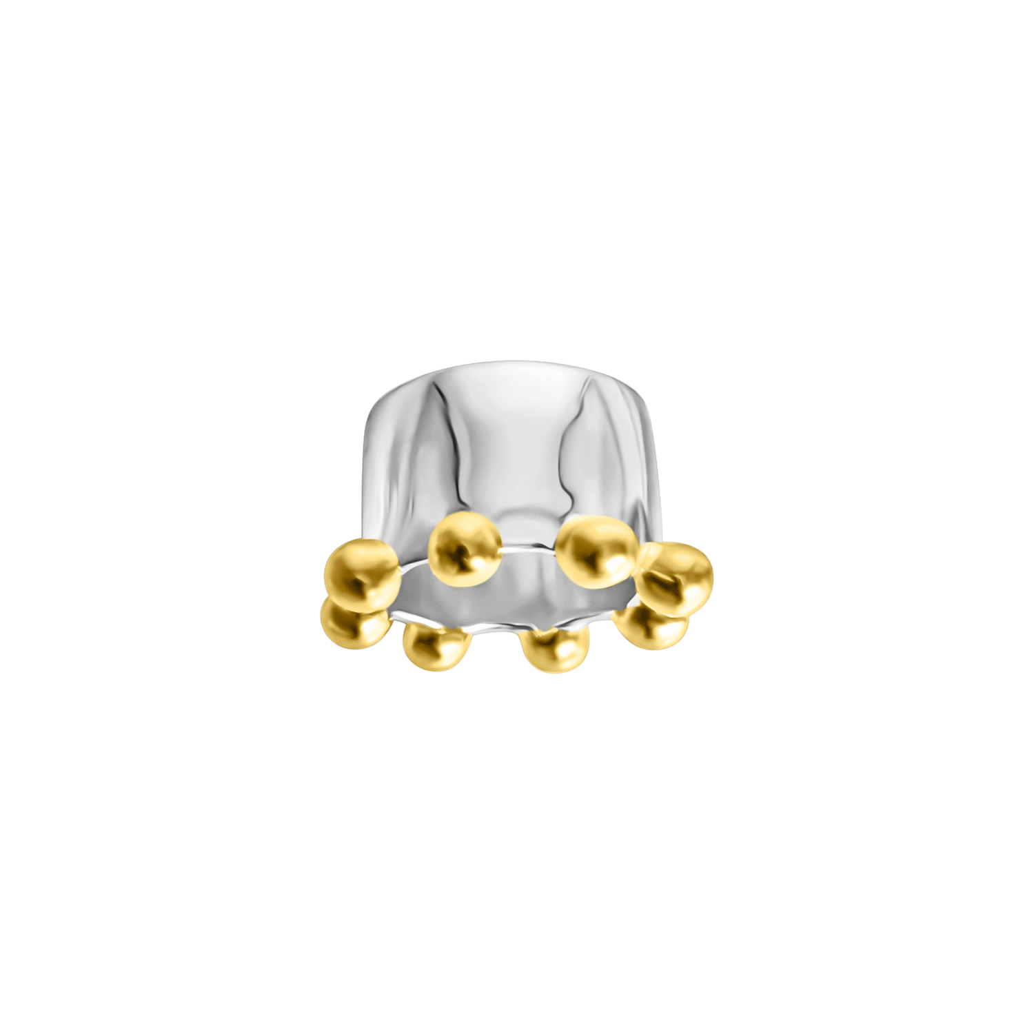 THIS TWO-TONE WIDE BAND RING, INSPIRED BY JEAN PUIFORCAT'S FRENCH ART DECO VASE, FEATURES STERLING SILVER BAND AND VERMEIL SPHERES AT ITS BASE. THE DESIGN ECHOES PUIFORCAT'S ELEGANT GEOMETRIC AESTHETIC, COMBINING MODERN SOPHISTICATION WITH VINTAGE CHARM. NAMED AFTER THE DISTINCTIVE HAT-SHAPED LOS ANGELES RESTAURANT / POPULAR DINING SPOT OF HOLLYWOOD STARS. OPENING IN 1926, THE DERBY QUICKLY BECAME AN ICONIC PART OF HOLLYWOOD'S SOCIAL SCENE.