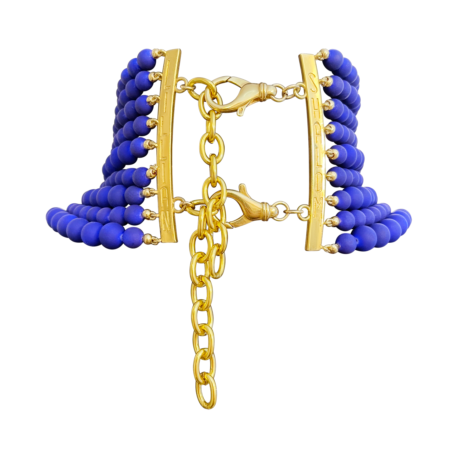 COMPOSITION: 9 ROWS OF COBALT BLUE HAND STRUNG BEADS 3 INCH GOLD VERMEIL CLASP, GOLD FILL CHAIN