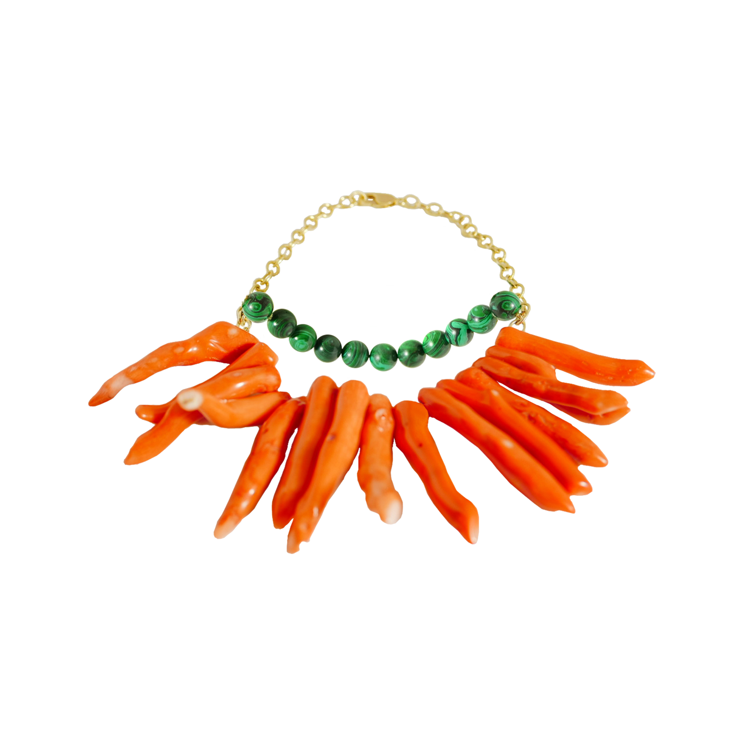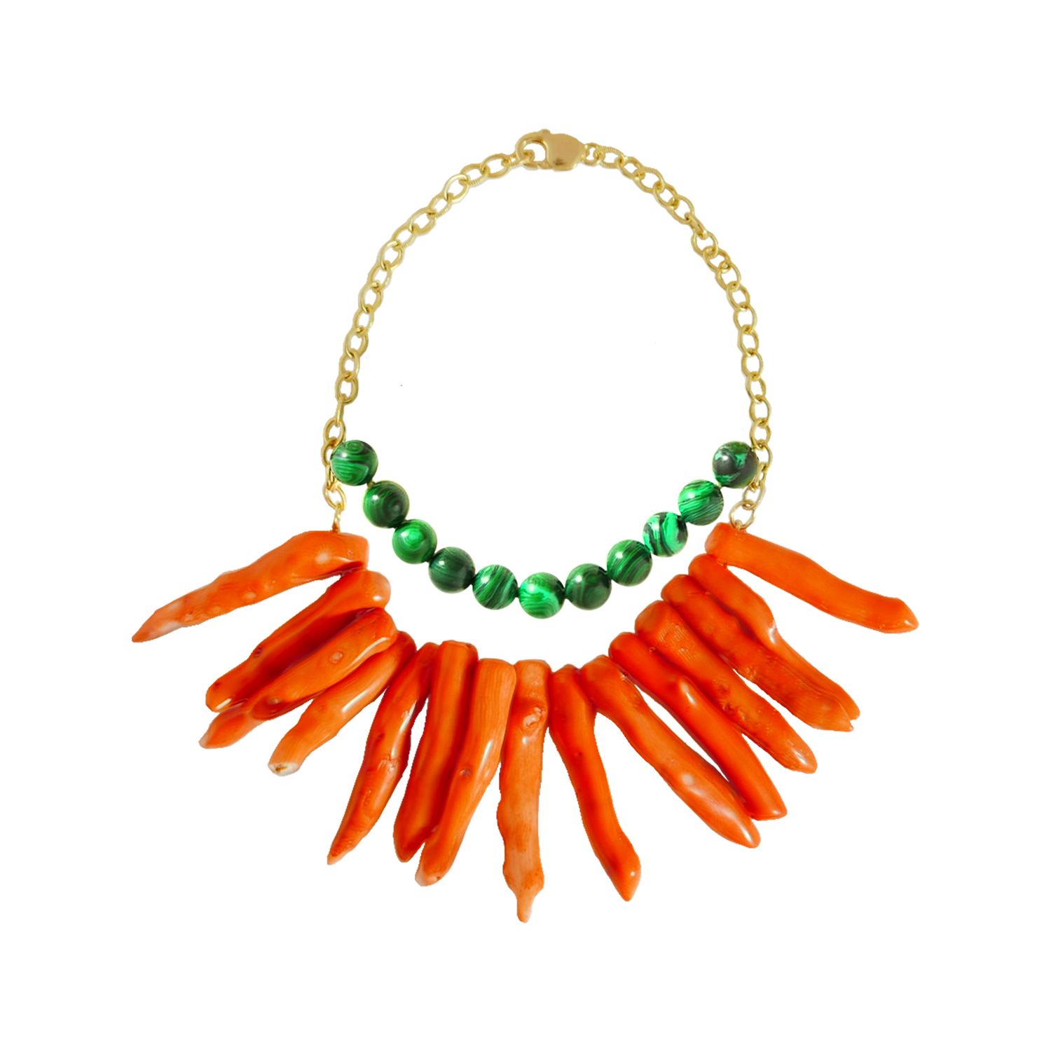 COMPOSITION: TANGERINE CHILI CORAL, LAYERED WITH 6MM NATURAL MALACHITE BEADS GOLD DIPPED CHAIN AND CLASP