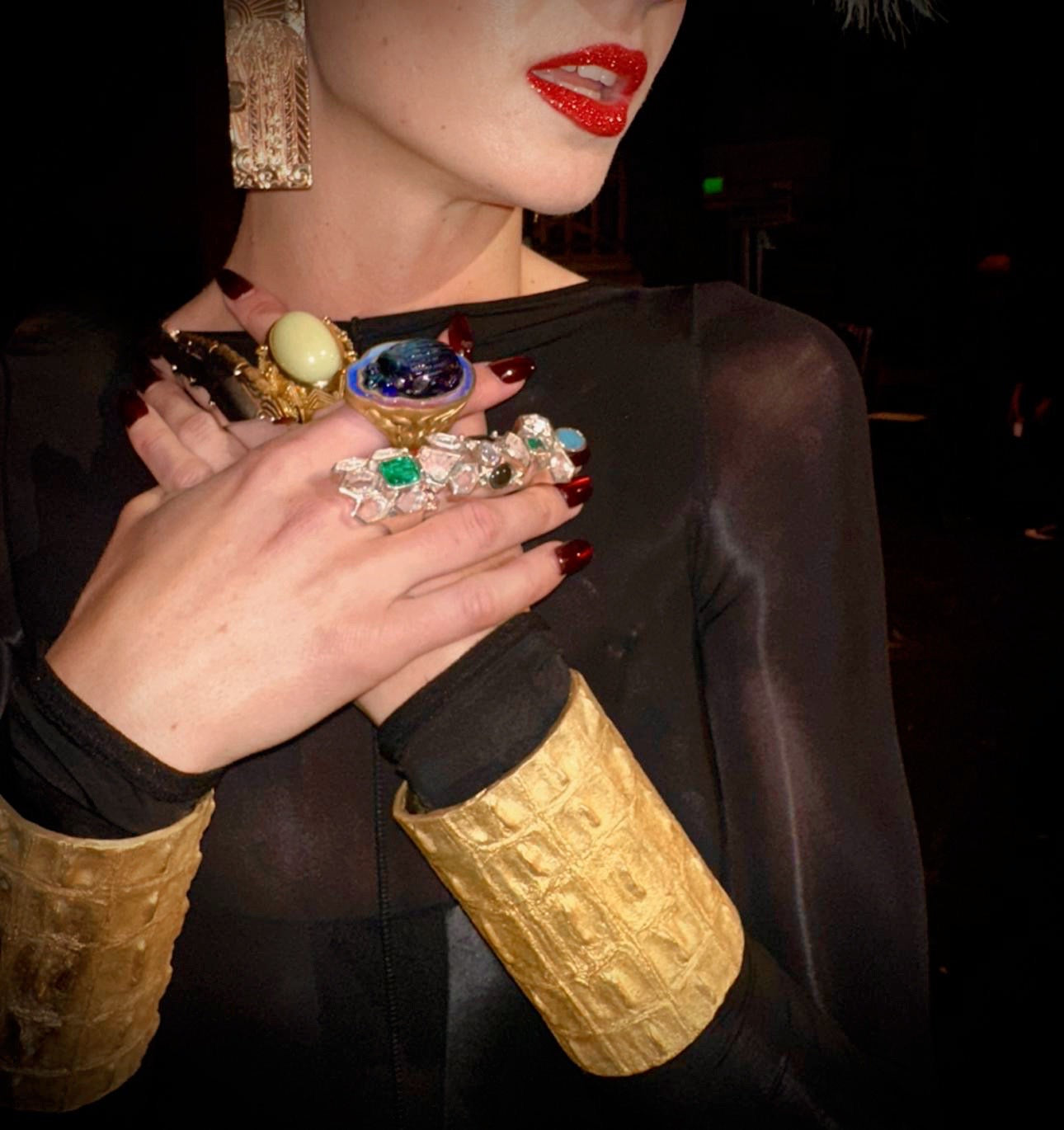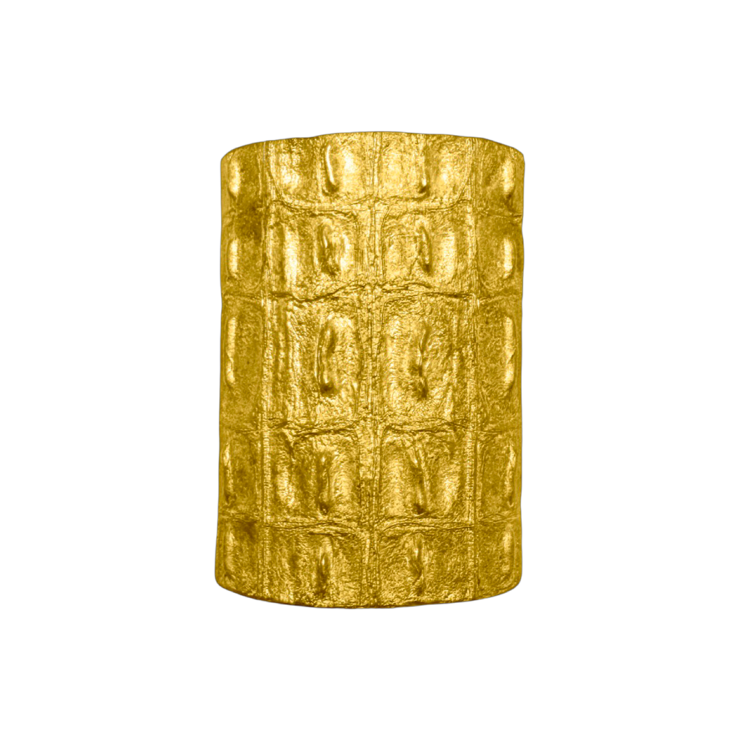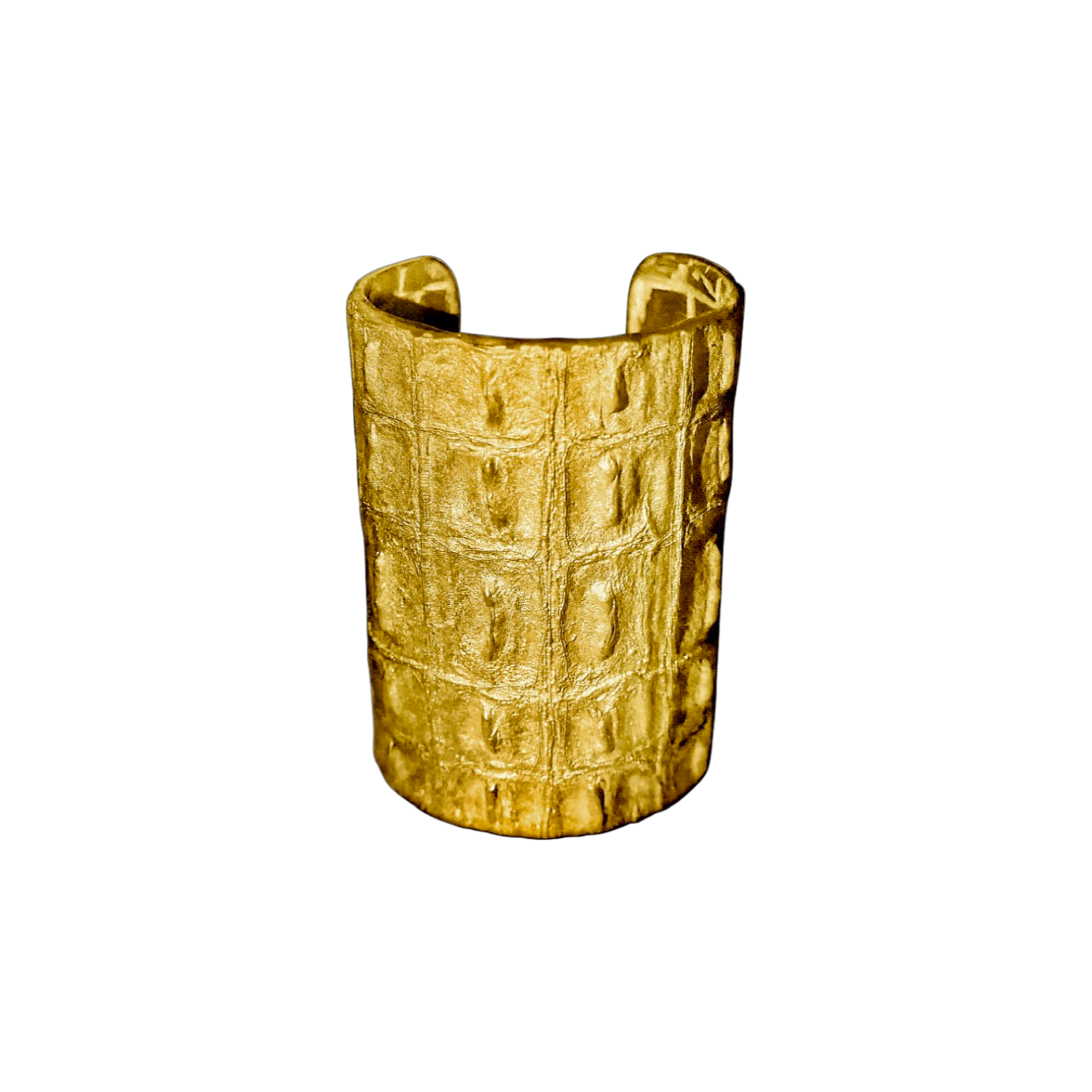 INTRODUCING CUGAT. BOLD YET STYLISH STATEMENT CUFF BRACELET, FEATURING AN EYE-CATCHING REALISTIC CROCODILE TEXTURE DESIGN. INSPIRED BY THE 1972 WORK OF CLAUDE LALANNE'S "CROCODILE" SERIES, THIS PIECE EFFORTLESSLY COMBINES RUGGED TEXTURE WITH MODERN DESIGN. NAMED AFTER XAVIER CUGAT, THE ICONIC LATIN BAND LEADER KNOWN FOR HIS CONTRIBUTIONS TO MUSIC AND HIS STYLISH SENSE OF FASHION.