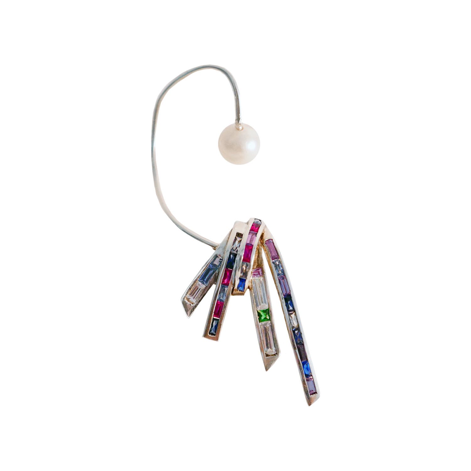 COMPOSITION: 925 STERLING SILVER SET WITH AN ASSORTMENT OF MULTI TONE PASTEL BAGUETTE CUT SAPPHIRES SINGLE WHITE PEARL