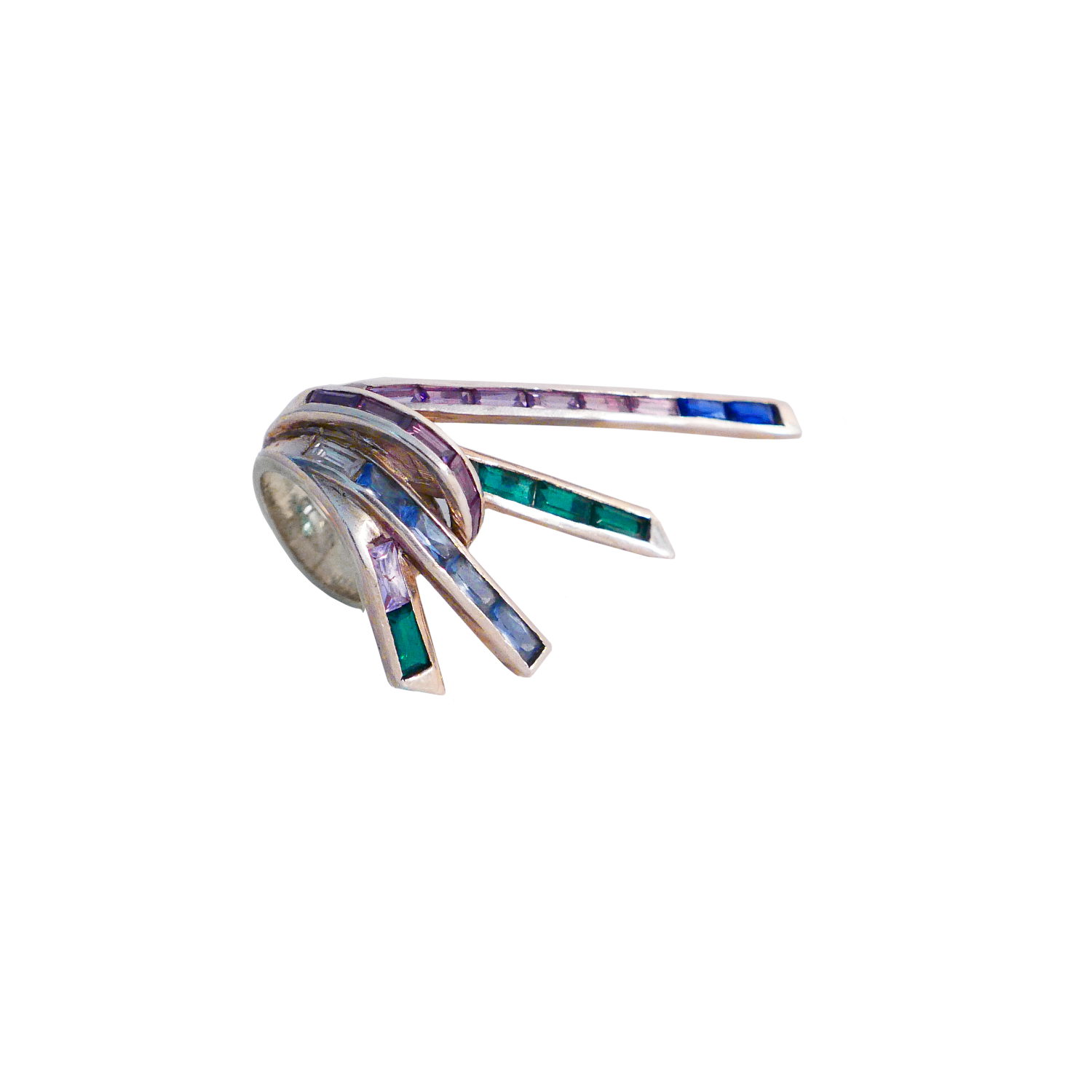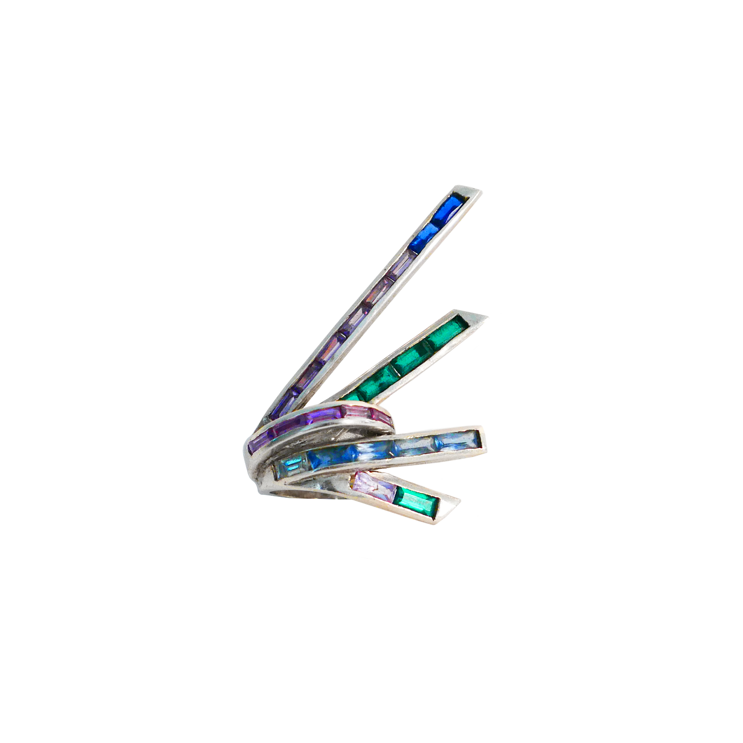 COMPOSITION: 925 STERLING SILVER SET WITH AN ASSORTMENT OF INTRICATELY HAND-SET NATURAL BLUE, PINK, PURPLE, GREEN BAGUETTE CUT SAPPHIRES