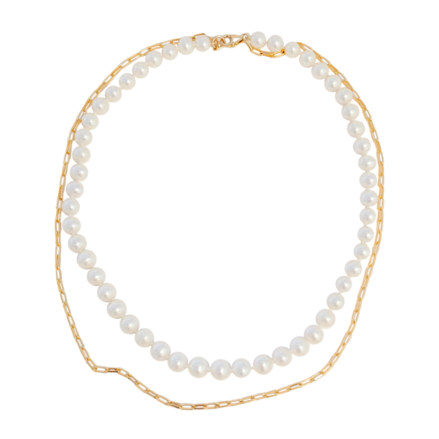 COMPOSITION: GOLD FILLED CHAIN NECKLACE PAIRED WITH A STRING OF PERFECTLY ROUND 12MM FRESHWATER PEARLS