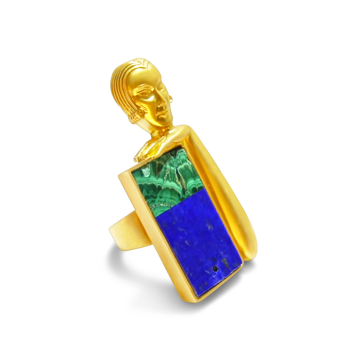 INSPIRED BY THE WORK OF AUSTRIAN ARTIST FRANZ HAGENAUER, THIS GILDED SCULPTURAL ART DECO RING FEATURES A RECTANGULAR LAPIS AND MALACHITE STONE INLAY WITH A SCULPTURAL FEMALE FIGURE (A FEMALE HEAD WITH PROPPED UP ARM). THE DESIGN CAPTURES HAGENAUER'S SIGNATURE BLEND OF MODERNISM AND MINIMALISM, TRANSFORMING THE PIECE INTO A WEARABLE ART FORM THAT IS BOTH INTRIGUING AND SOPHISTICATED.