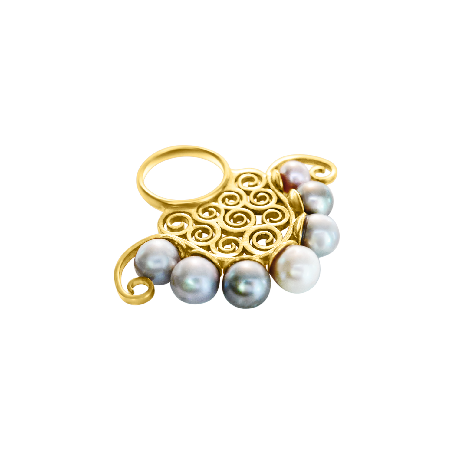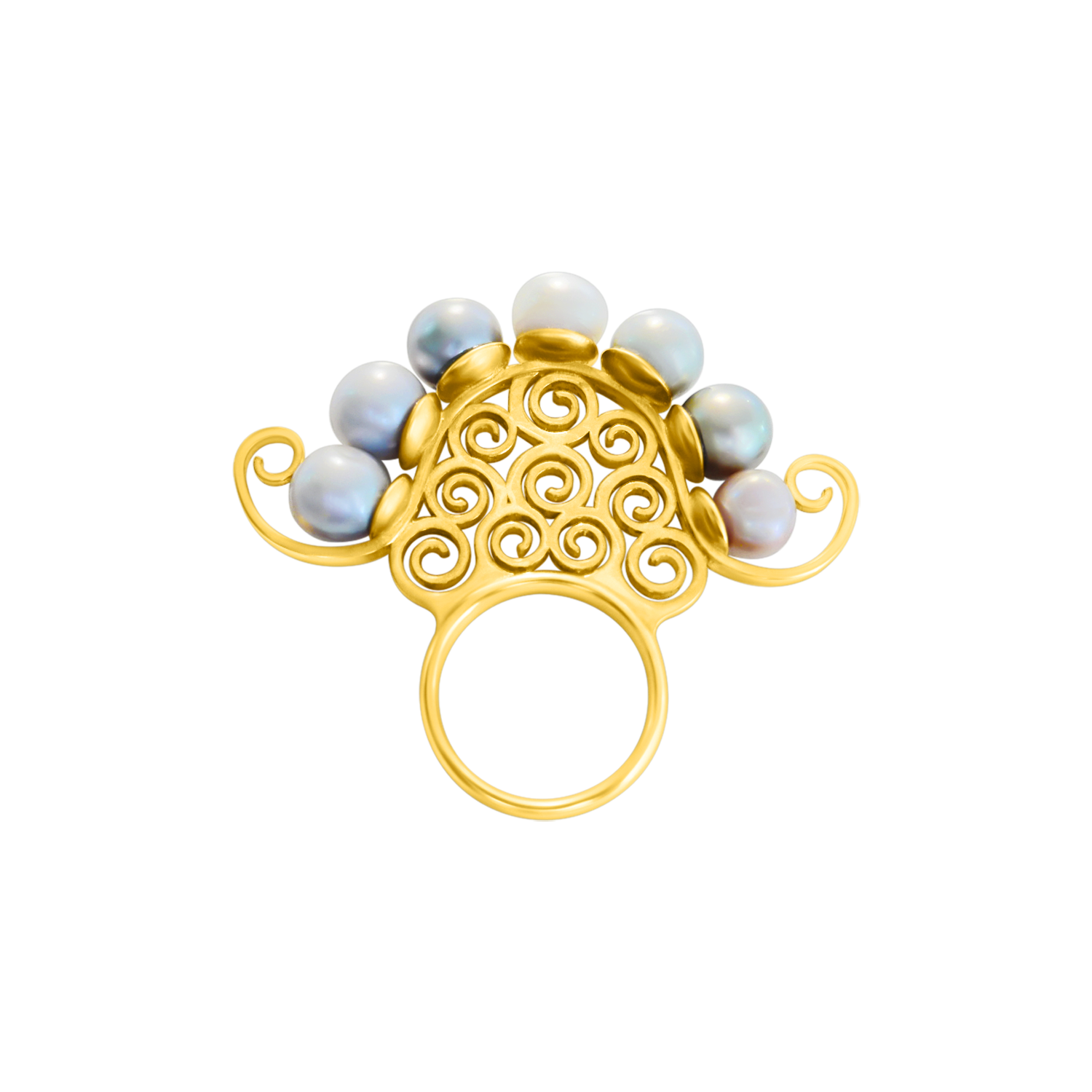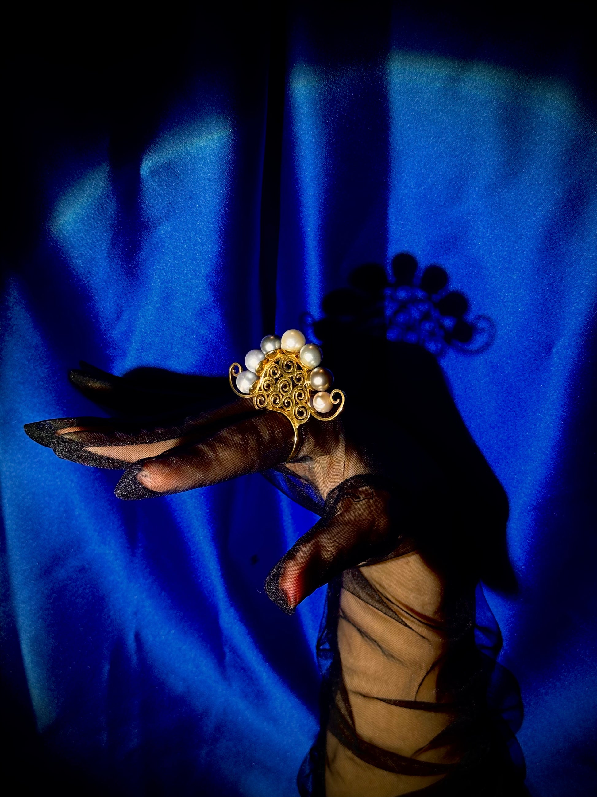 THE MULTI PEARL RING IN AN ART DECO FAN SHAPE DESIGN FEATURES A SOPHISTICATED ARRANGEMENT REMINISCENT OF 1920S HAIRPIECES. IT SHOWCASES A SERIES OF LUSTROUS PEARLS RADIATING IN A FAN-LIKE PATTERN, SET IN A GEOMETRIC, SYMMETRICAL FRAMEWORK. THIS ELEGANT PIECE COMBINES VINTAGE CHARM WITH MODERN AESTHETICS, EMBODYING THE BOLD AND DECORATIVE STYLE CHARACTERISTIC OF THE ART DECO ERA.