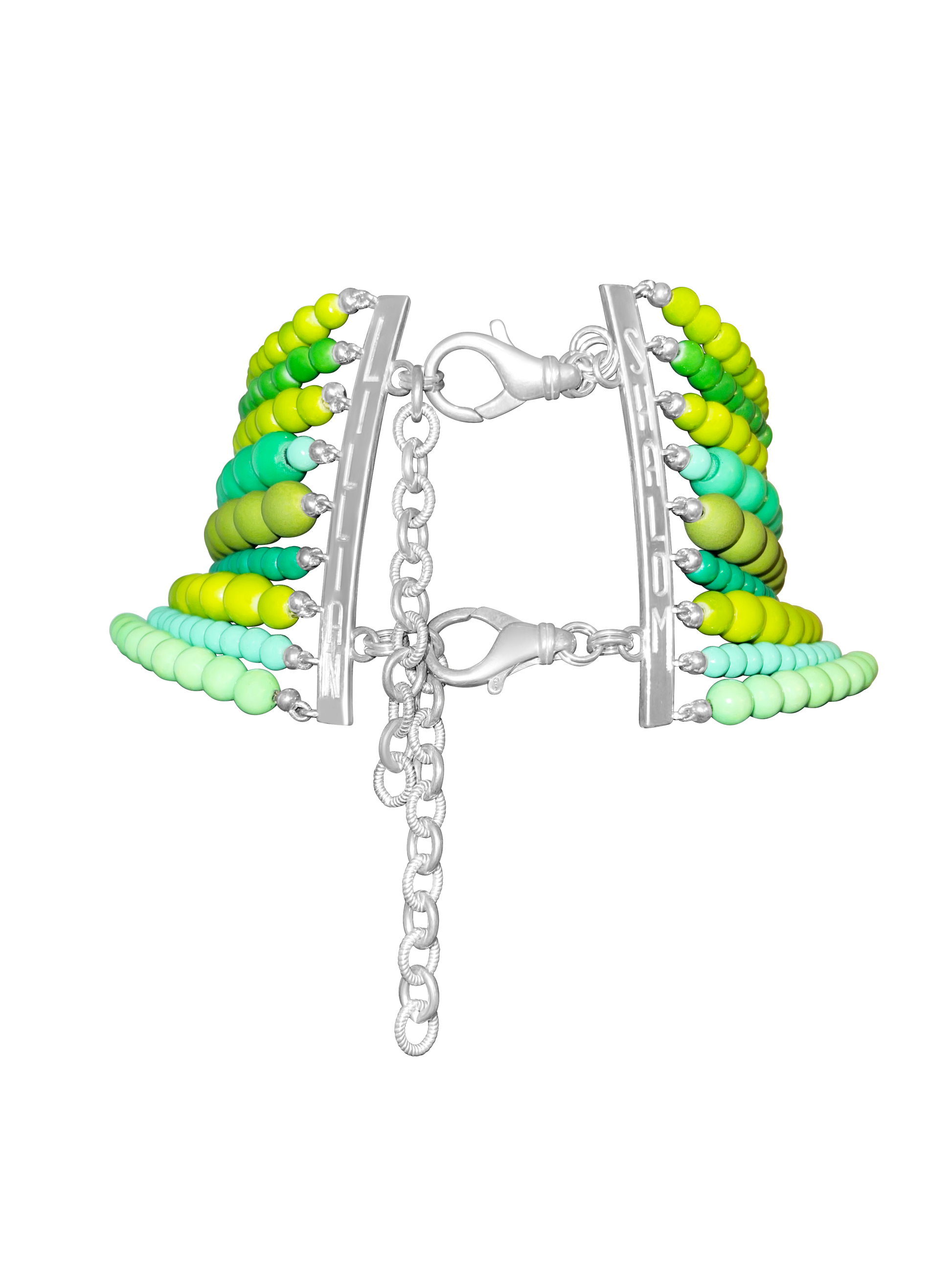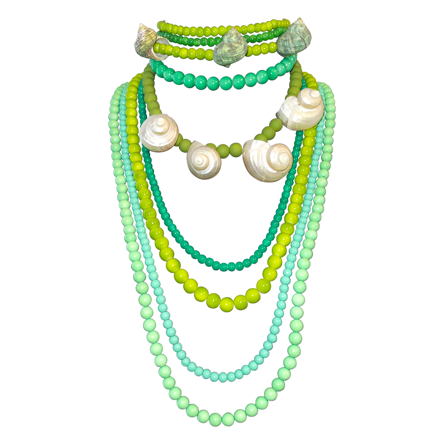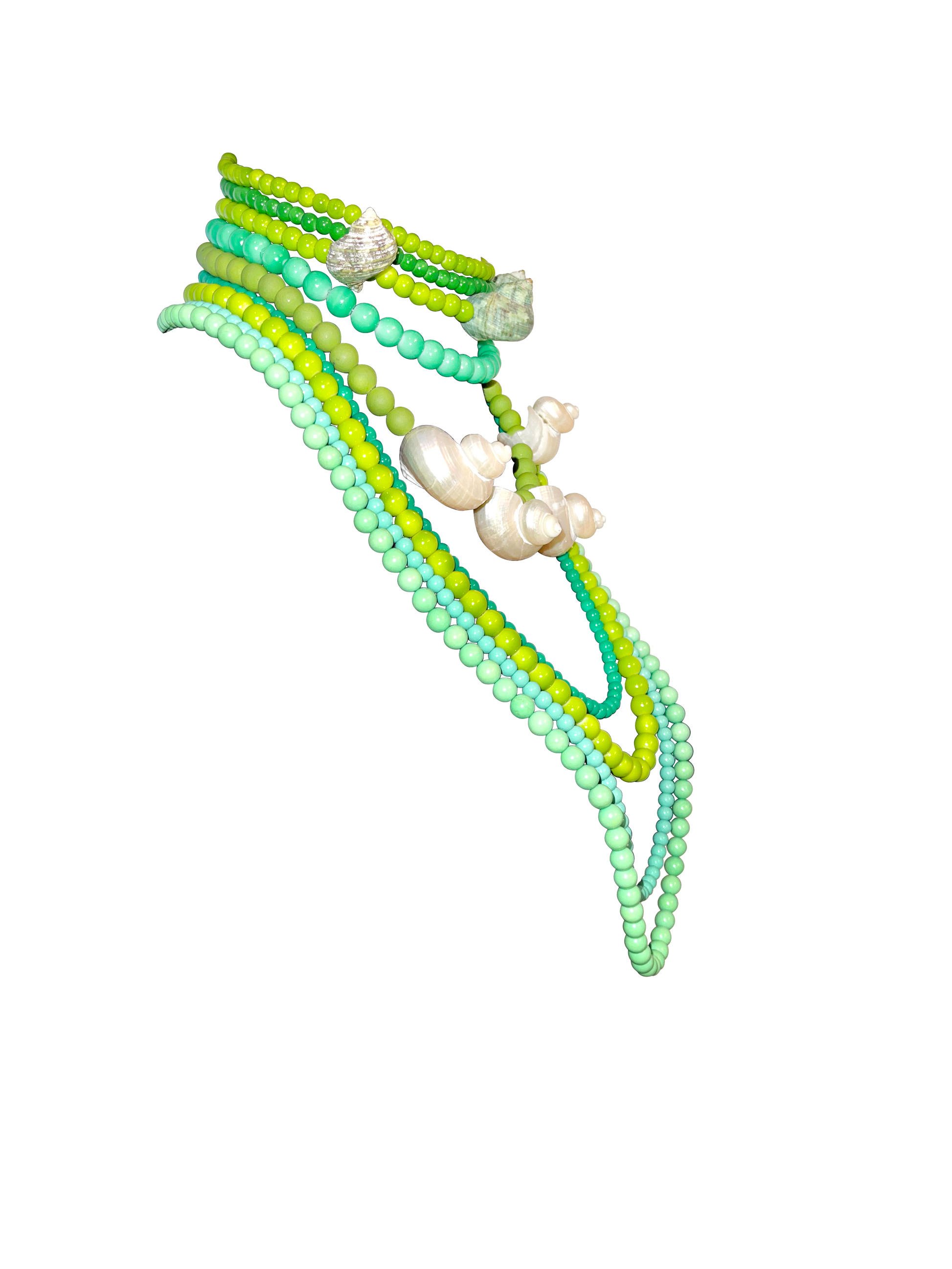COMPOSITION: 9 ROWS OF GREEN TONED HAND STRUNG BEADS AND NATURAL TURBO SHELLS 1.5-2''