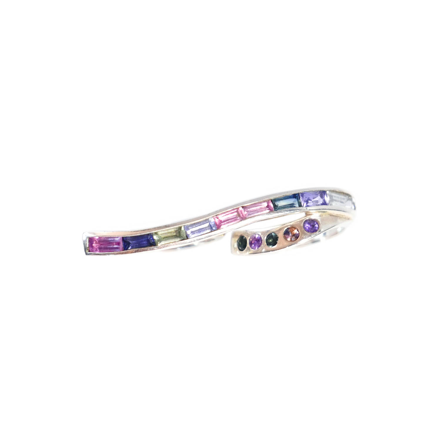 COMPOSITION: 925 STERLING SILVER BEZEL INTRICATELY HAND-SET WITH AN ASSORTMENT OF MULT-TONED BAGUETTE CUT PASTEL SAPPHIRES ACCOMPANIED BY 5 ROUND PAVE SET SAPPHIRES
