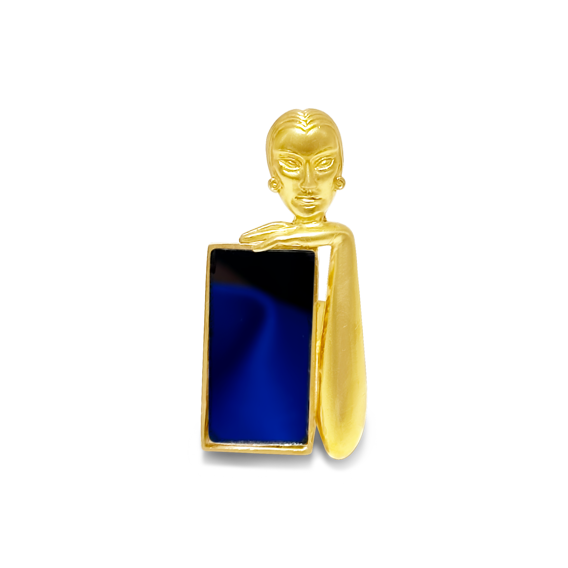 INSPIRED BY THE WORK OF AUSTRIAN ARTIST FRANZ HAGENAUER, THIS GILDED SCULPTURAL ART DECO RING FEATURES A MIRROR WITH A SCULPTURAL FEMALE FIGURE (A FEMALE HEAD WITH PROPPED UP ARM). THE DESIGN CAPTURES HAGENAUER'S SIGNATURE BLEND OF MODERNISM AND MINIMALISM, TRANSFORMING THE PIECE INTO A WEARABLE ART FORM THAT IS BOTH INTRIGUING AND SOPHISTICATED.