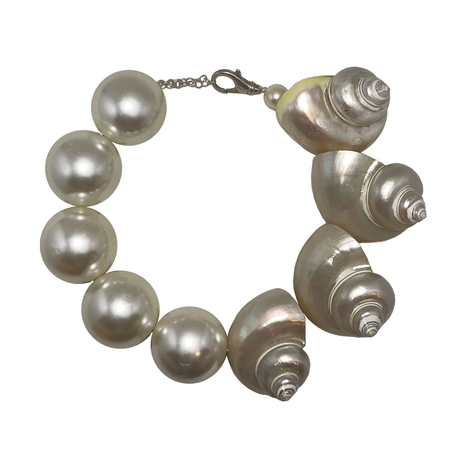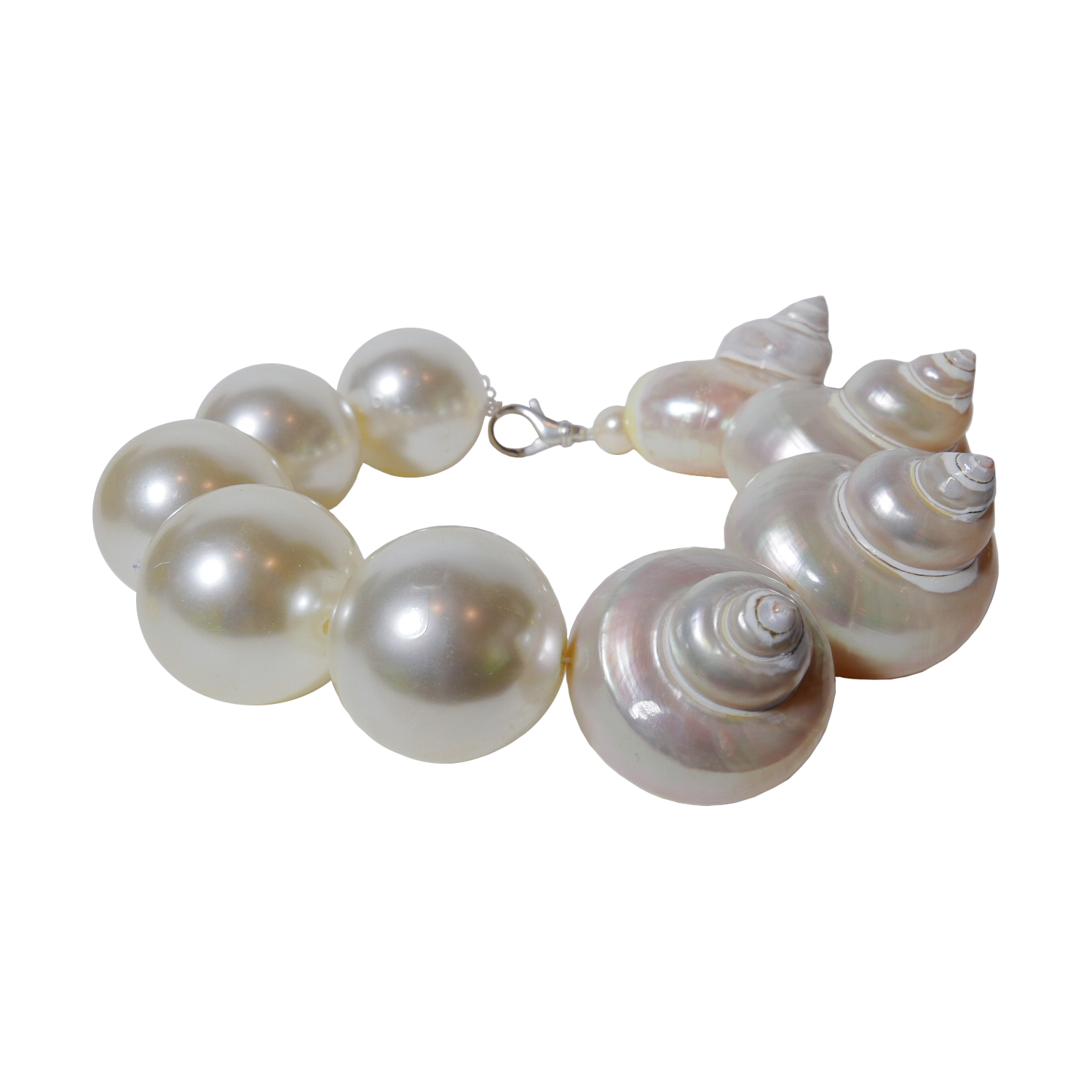 COMPOSITION: FOUR 2.5” TURBO PEARLED SHELLS and JUMBO PEARL BEADS CLASP
