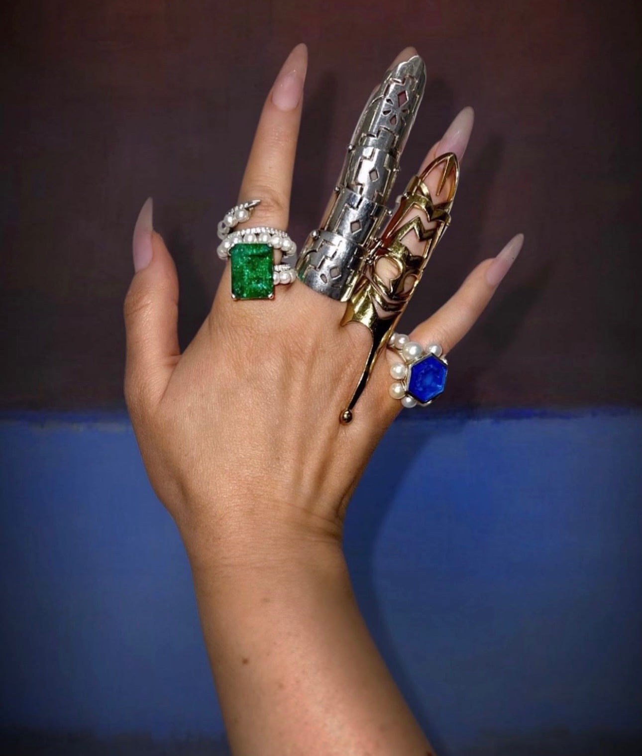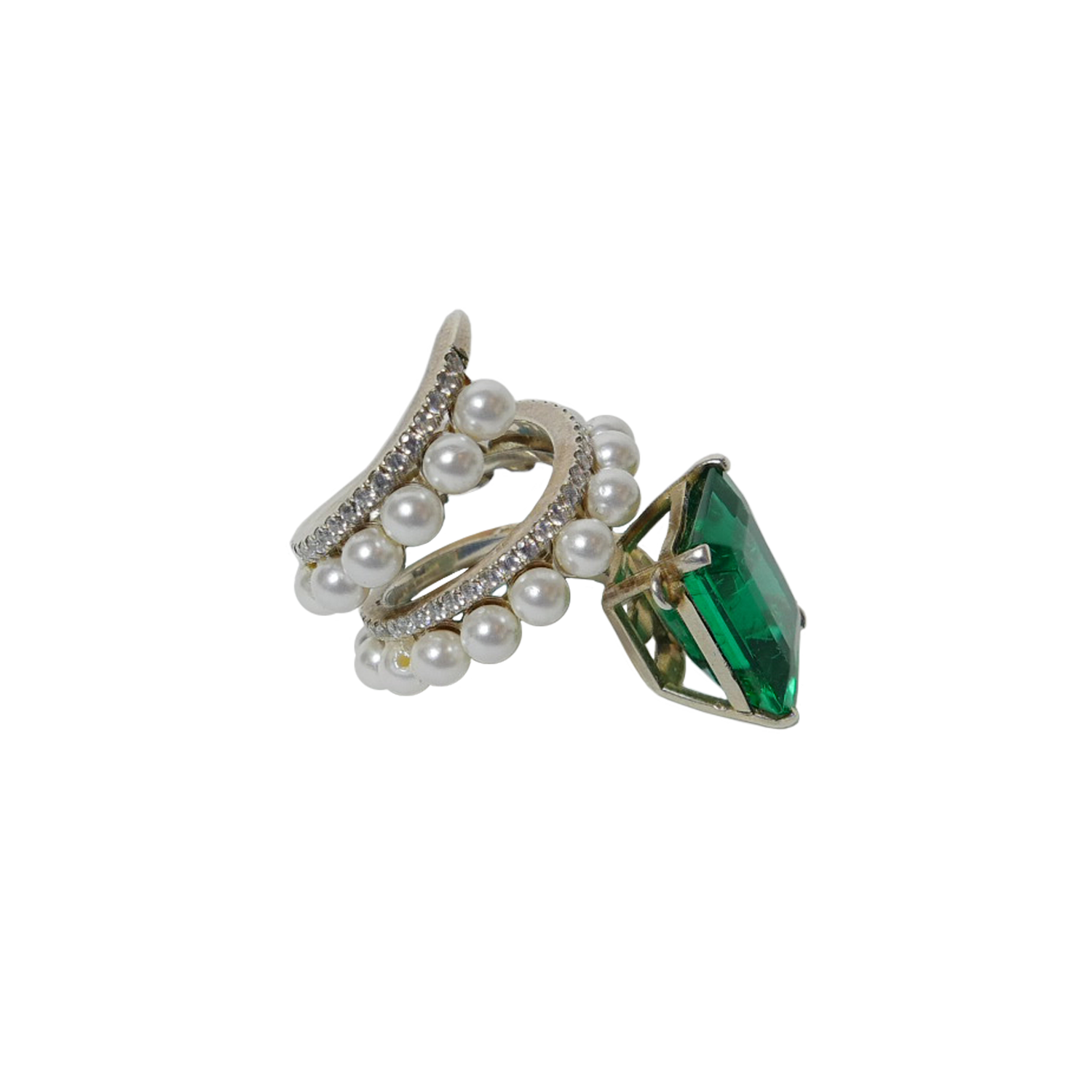 EXQUISITE SERPENTINE PEARL SHANK SET WITH A 12 CARAT EMERALD STATEMENT RING