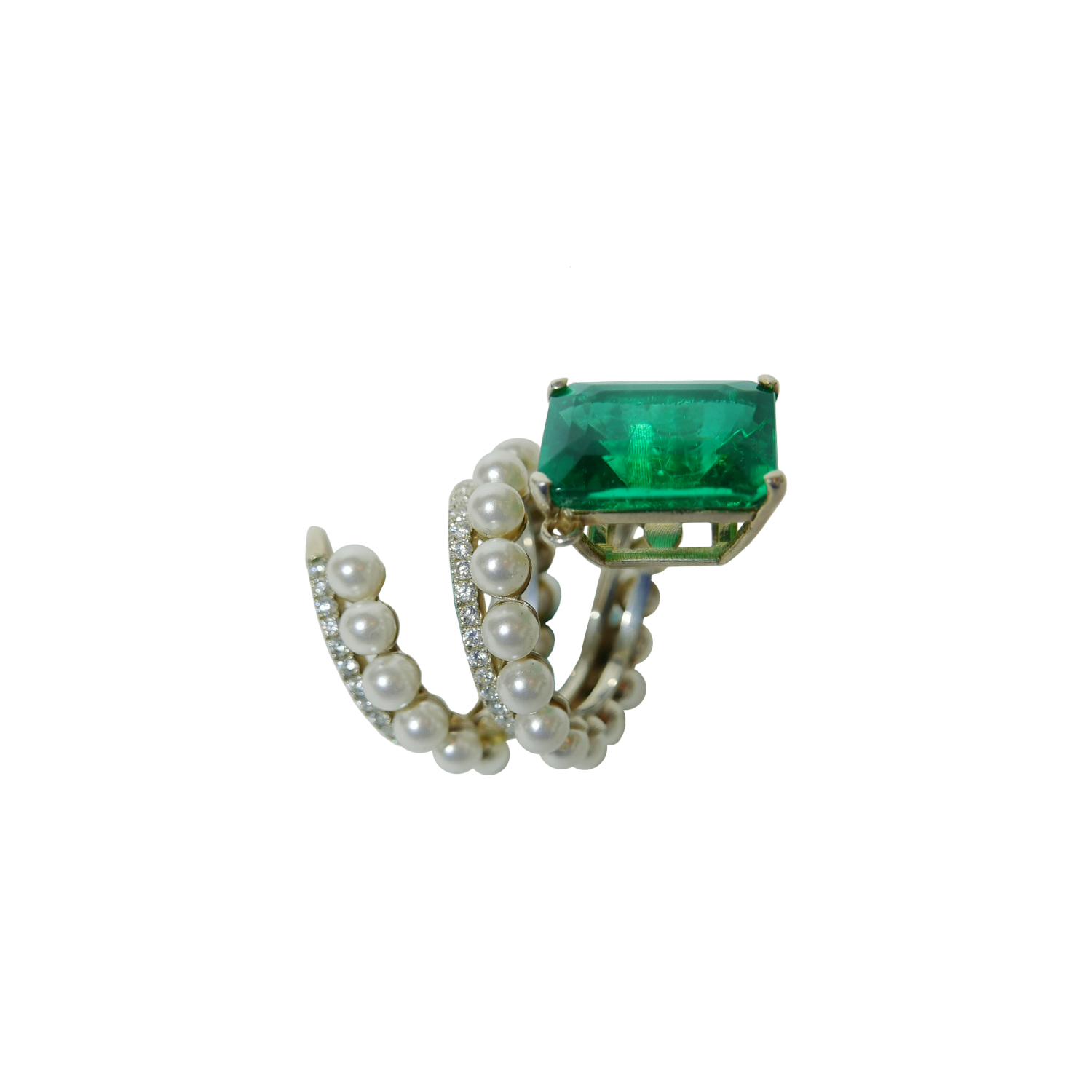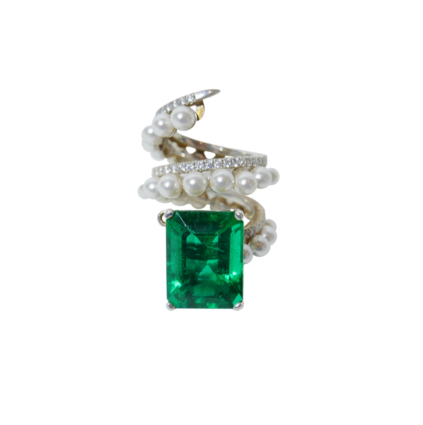 COMPOSITION: WHITE GOLD 12 CARAT RADIANT CUT EMERALD WITH SERPENTINE SPIRAL SHANK SET WITH FRESHWATER PEARLS AND MICRO DIAMONDS