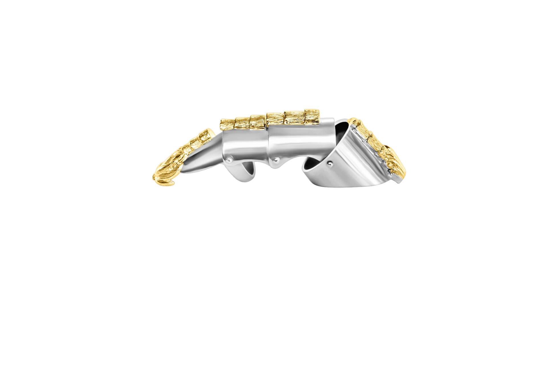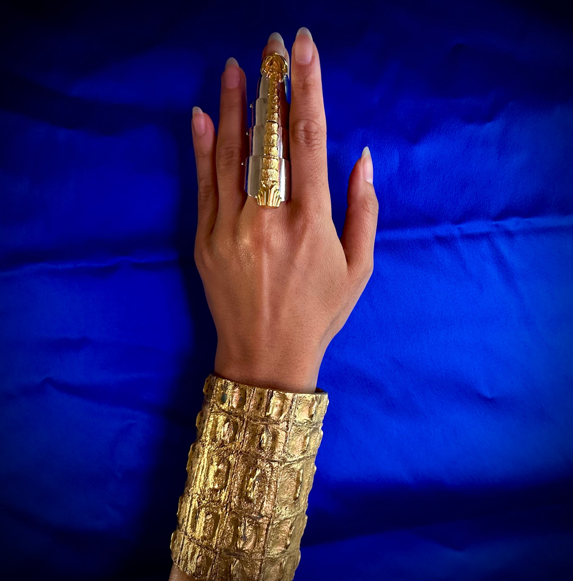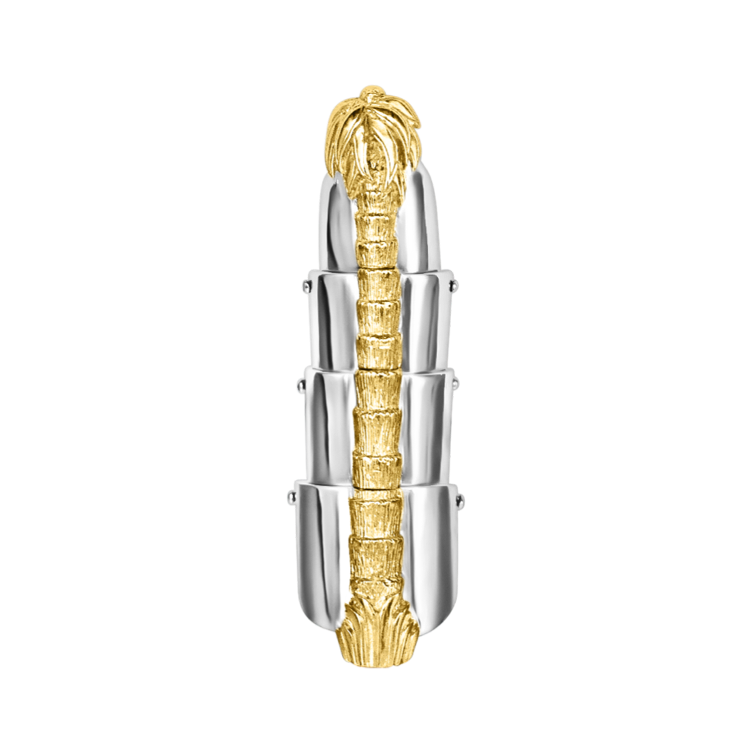 THE COCOANUT GROVE ARTICULATED ARMOR RING SHOWCASES A STRIKING RAISED PALM TREE DESIGN AT ITS CENTER, CRAFTED IN A SOPHISTICATED TWO-TONE SILVER AND GOLD FINISH. THE SEGMENTED STRUCTURE OF THE RING ALLOWS FOR FLEXIBILITY AND COMFORT, WHILE THE CONTRASTING COLORS HIGHLIGHT THE DETAILED PALM TREE MOTIF. THIS ARMOR RING IS AN ADDITION TO SHALOM’S SIGNATURE ARMOR PIECES. NAMED AFTER THE COCOANUT GROVE, THE INFAMOUS NIGHTCLUB IN LOS ANGELES THAT OPERATED FROM 1927 TO 1989. LOCATED AT THE AMBASSADOR HOTEL, IT WAS KNOWN FOR ITS GLAMOROUS AND LUXURIOUS ATMOSPHERE DURING HOLLYWOOD'S GOLDEN AGE. THE CLUB FEATURED TROPICAL-THEMED DECOR, INCLUDING HUNDREDS OF PALM TREES AND A LARGE DANCE FLOOR.