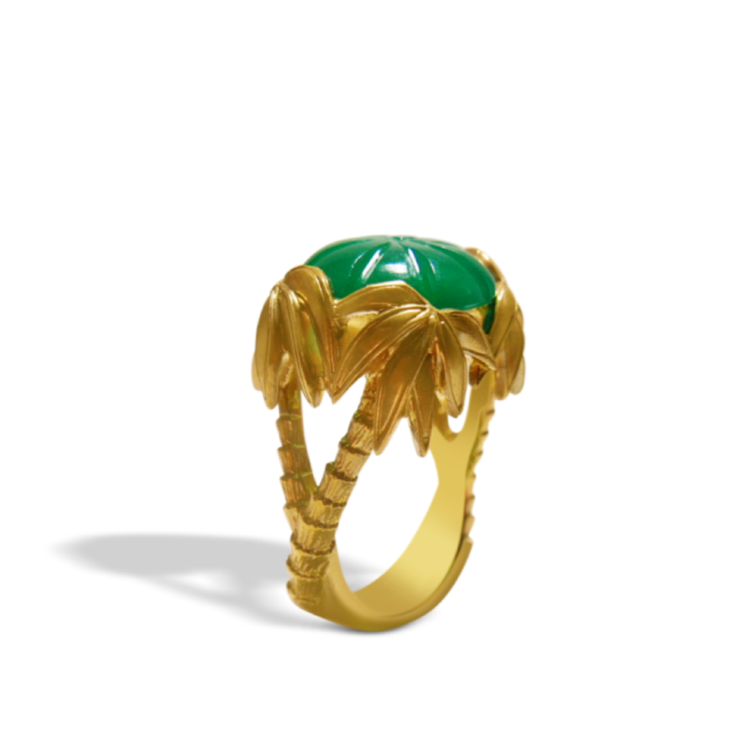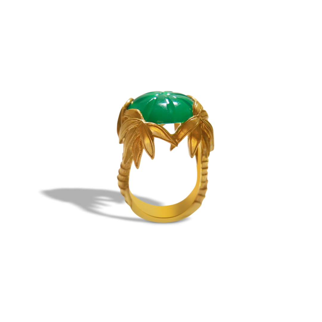 FOUR INTERMINGLED PALM TREES HOLD UP A CARVED GREEN ONYX CABOCHON IN THIS EXQUISITE RING, PAYING HOMAGE TO LOS ANGELES AND ITS PALM-LINED STREETS. THE INTRICATE DESIGN ALSO PAYS HOMAGE TO THE RETRO GILDED PALM TREE LAMPS OF THE 1970S, CAPTURING THE ESSENCE OF THE CITY'S ICONIC LANDSCAPE AND VINTAGE AESTHETIC. BLENDING ELEGANCE AND URBAN CHARM, THIS UNIQUE PIECE CELEBRATES THE VIBRANT SEMI TROPICAL SPIRIT AND NATURAL BEAUTY OF LOS ANGELES