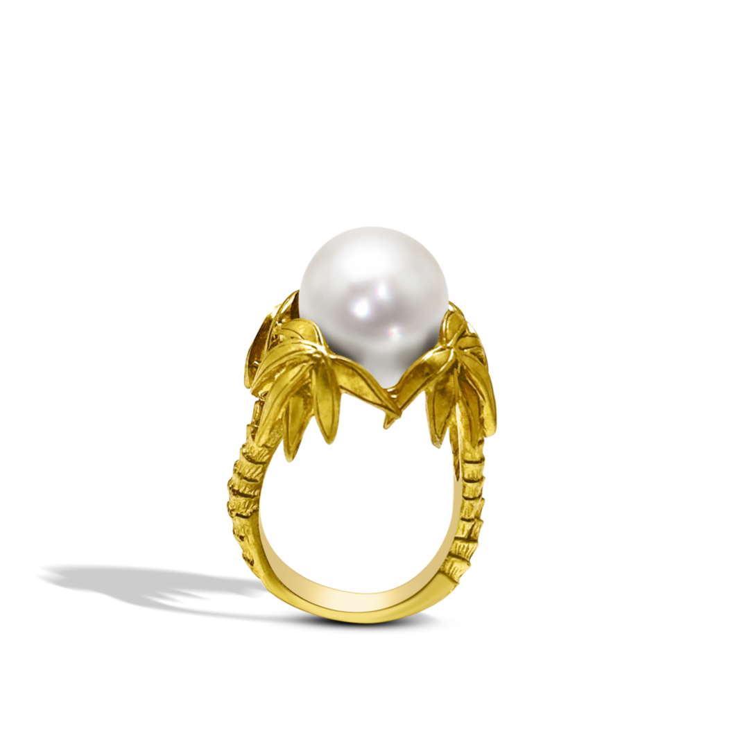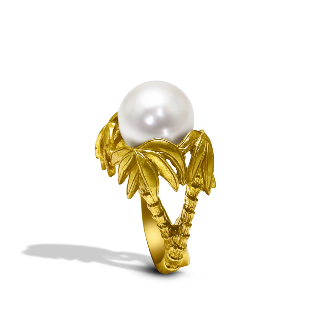 FOUR INTERMINGLED PALM TREES HOLD UP A LUSTROUS PEARL IN THIS EXQUISITE RING, PAYING HOMAGE TO LOS ANGELES AND ITS PALM-LINED STREETS. THE INTRICATE DESIGN ALSO PAYS HOMAGE TO THE RETRO GILDED PALM TREE LAMPS OF THE 1970S, CAPTURING THE ESSENCE OF THE CITY'S ICONIC LANDSCAPE AND VINTAGE AESTHETIC. BLENDING ELEGANCE AND URBAN CHARM, THIS UNIQUE PIECE CELEBRATES THE VIBRANT SEMI TROPICAL SPIRIT AND NATURAL BEAUTY OF LOS ANGELES.